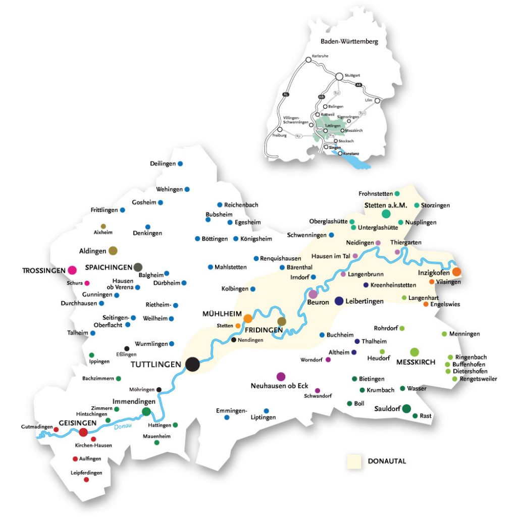 Auf den Höhen am Rande des Donautals, wo es zum bis über 800 Meter hoch geht, reichen die Gemarkungen von Kolbingen, Buchheim, Irndorf, Leibertingen, Schwenningen, Stetten am kalten Markt und Meßkirch-Langenhart bis an die Donau heran.