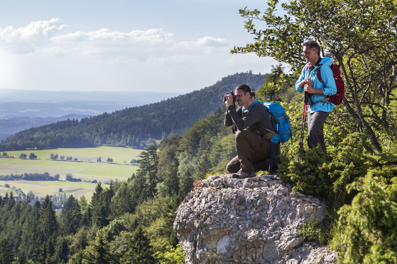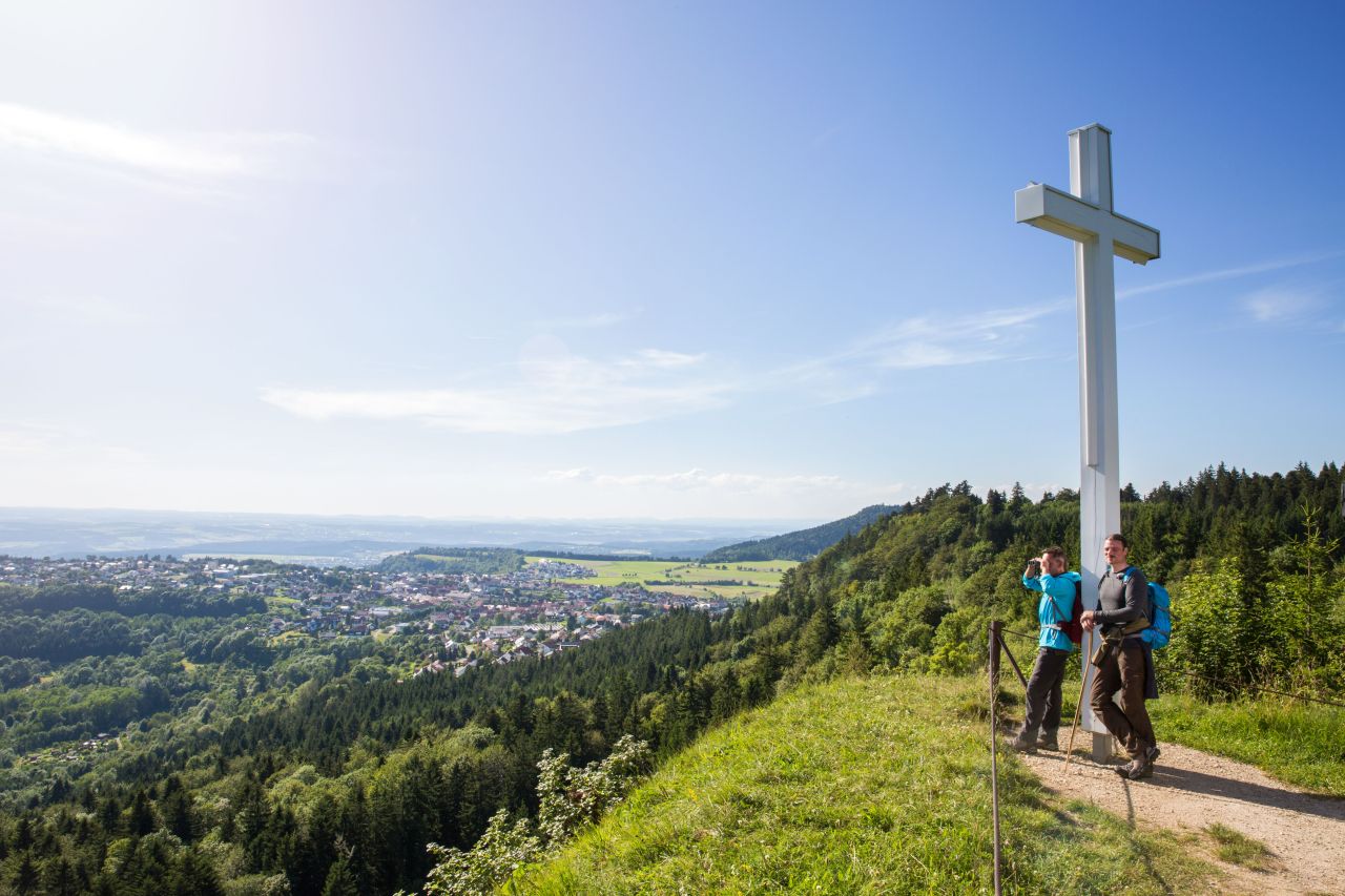 Auf dem „Klippeneck“ befindet sich mit ca. 980 m der höchstgelegene Segelflugplatz Deutschlands. Die Hochebene am Rande der Alb auf Gemarkung Denkingen fällt nach Westen hin steil ins Tal ab. Dies hat dem „Klippeneck“ eine kilometerlange Hangkante mit herrlichen Aussichtspunkten beschert. Wussten Sie, dass das „Klippeneck“ auch einer der sonnenreichsten Plätze Deutschlands ist? Am Ende der Etappe erwartet Sie, bevor Sie nach Spaichingen absteigen, der „Dreifaltigkeitsberg“ mit seinem einmaligen Ensemble von Kloster, Kirche und Aussichtsgaststätte.