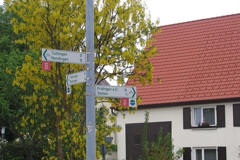 Nach dem Abstecher zum Kletterpark am Ortsende Riegertsbühlstraße zunächst ca. 1,5 km geradeaus in südlicher Richtung, dann vor dem Parkplatz links und weitere ca. 5 km auf der kleinen Straße nach Mühlheim-Stetten. Ab Friedhof abwärts durch die Josef-Lang-Straße über die Eisenbahnbrücke durch die Bachstraße und dem Donauradweg in Richtung Nendingen/Tuttlingen bis zum Ausgangspunkt folgen.